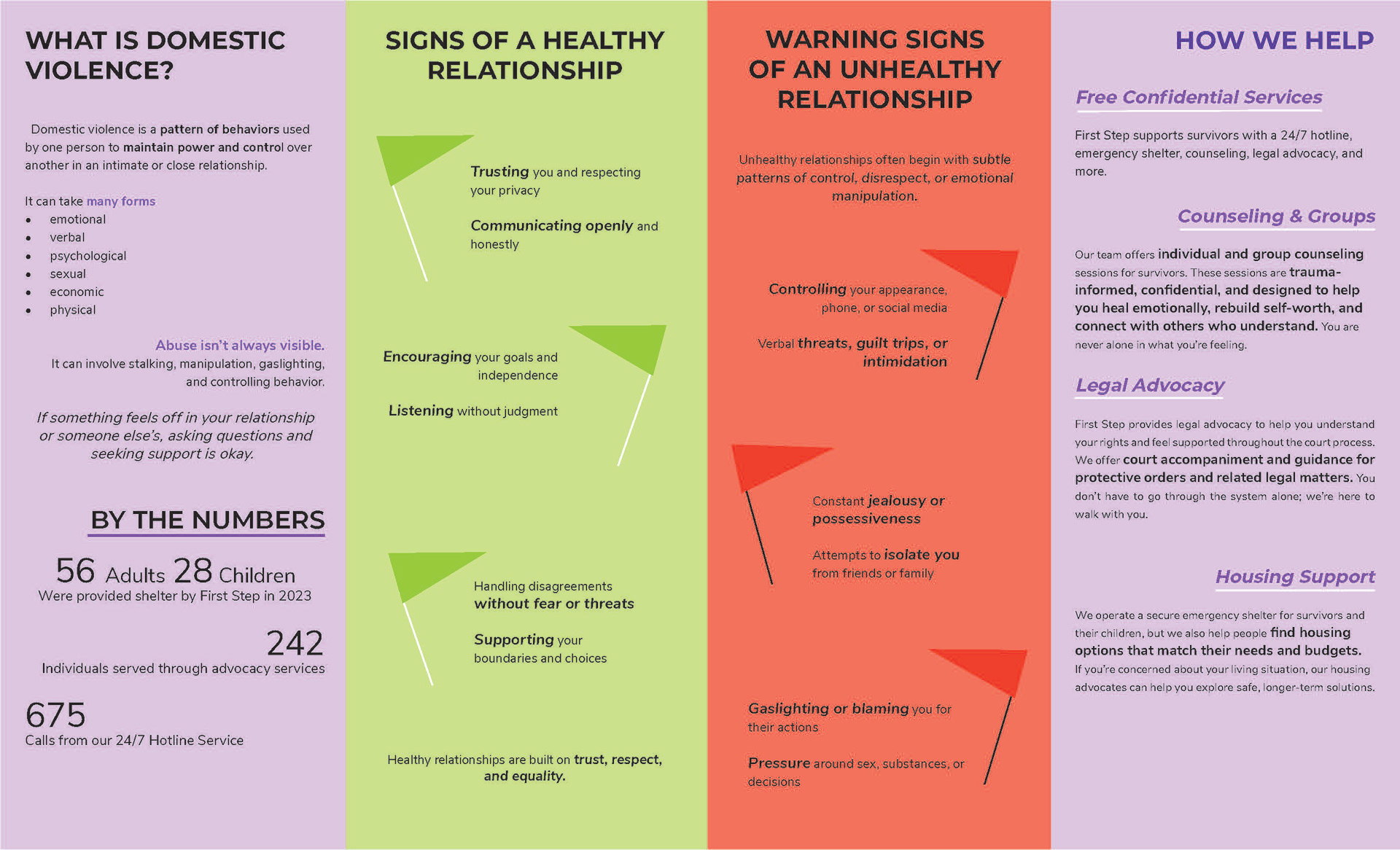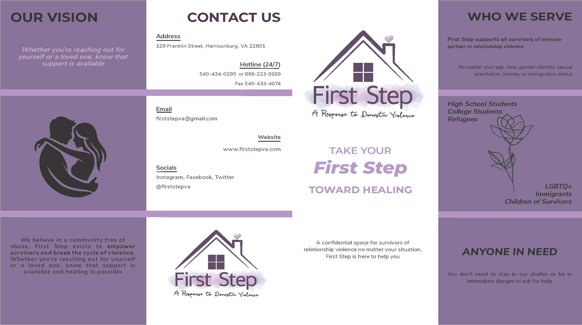 I redesigned a print brochure for First Step, a local nonprofit supporting survivors of domestic violence. Using professional typography and layout in Adobe InDesign, I elevated their message with improved hierarchy, minimal graphics, and warm, calming colors. The goal: to make essential resources more accessible, readable, and supportive for their diverse audience.