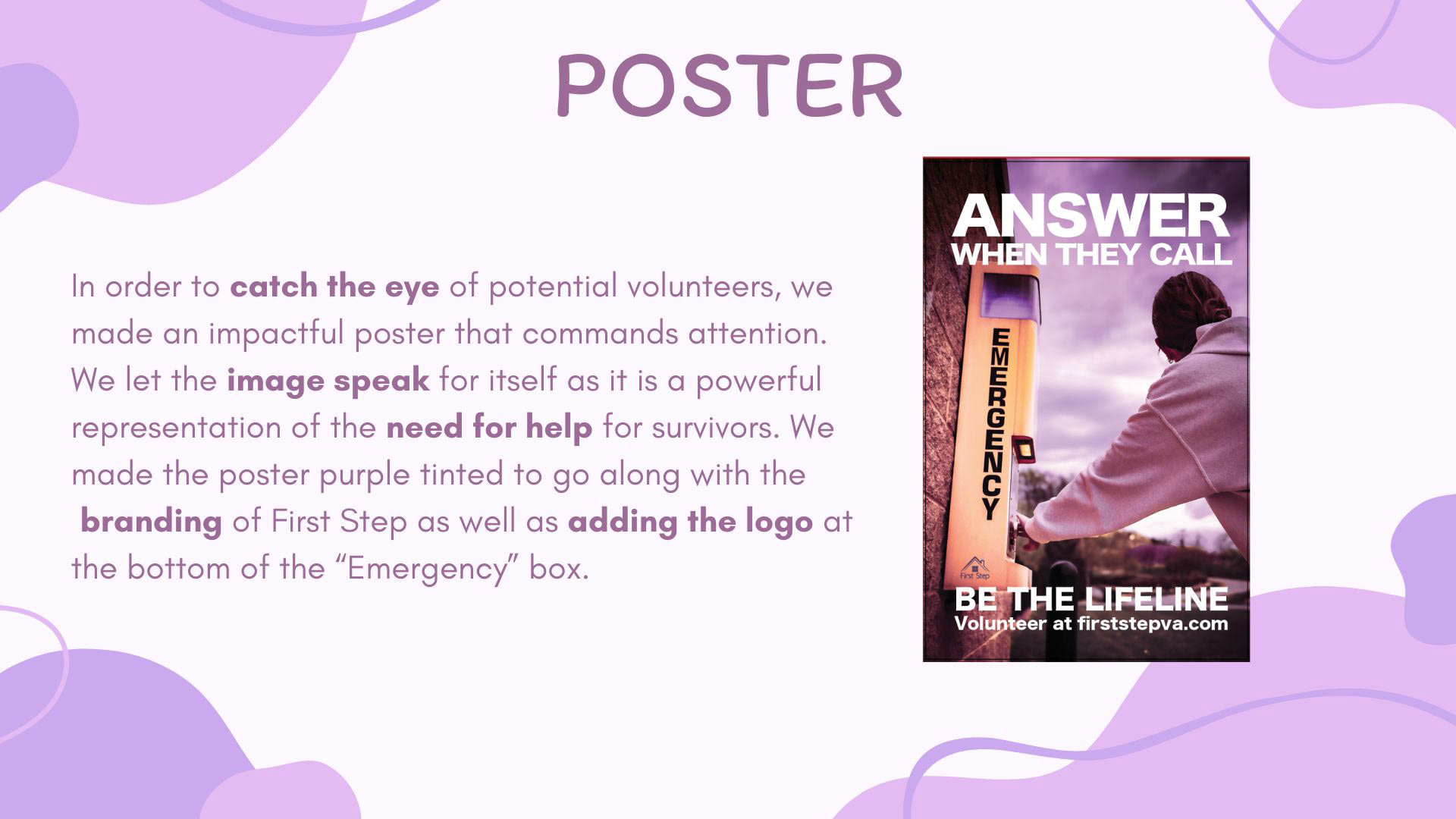 Our campaign, “Be the First Step,” encouraged college students and young adults to get involved through volunteering and advocacy. I was the lead creator of our video PSA, where I applied my skills in After Effects to develop a time-based piece that reinforced our campaign’s visual tone and emotional message. I also contributed to the overall visual direction and typography across the poster and social media deliverables, ensuring everything remained cohesive and on-brand.
