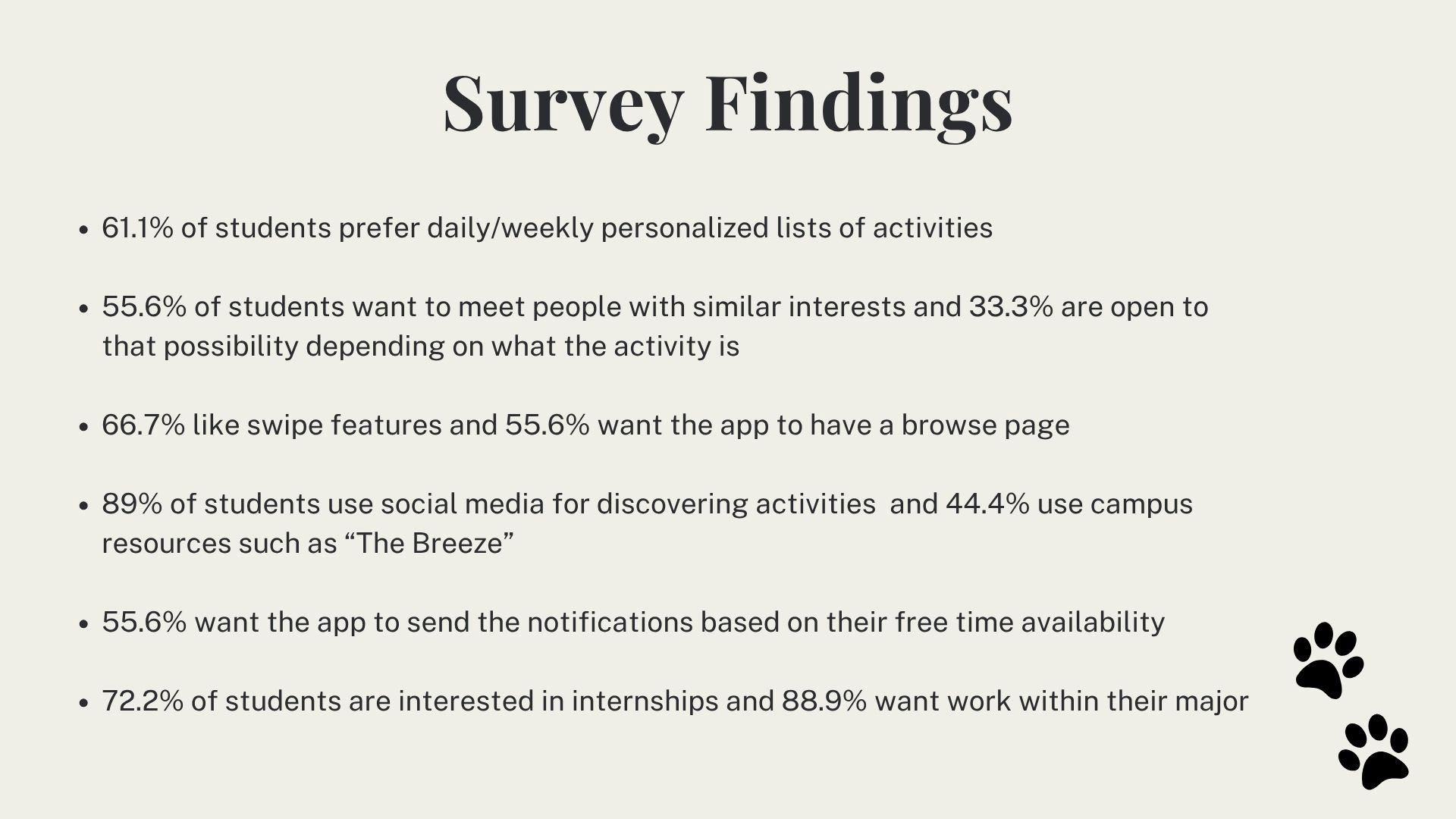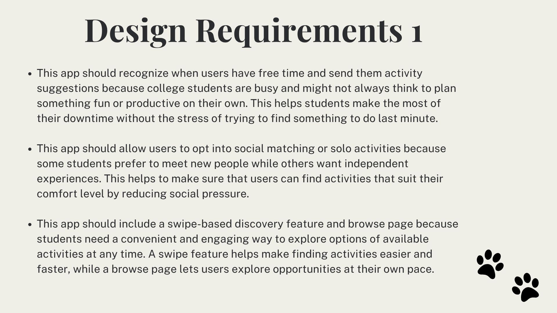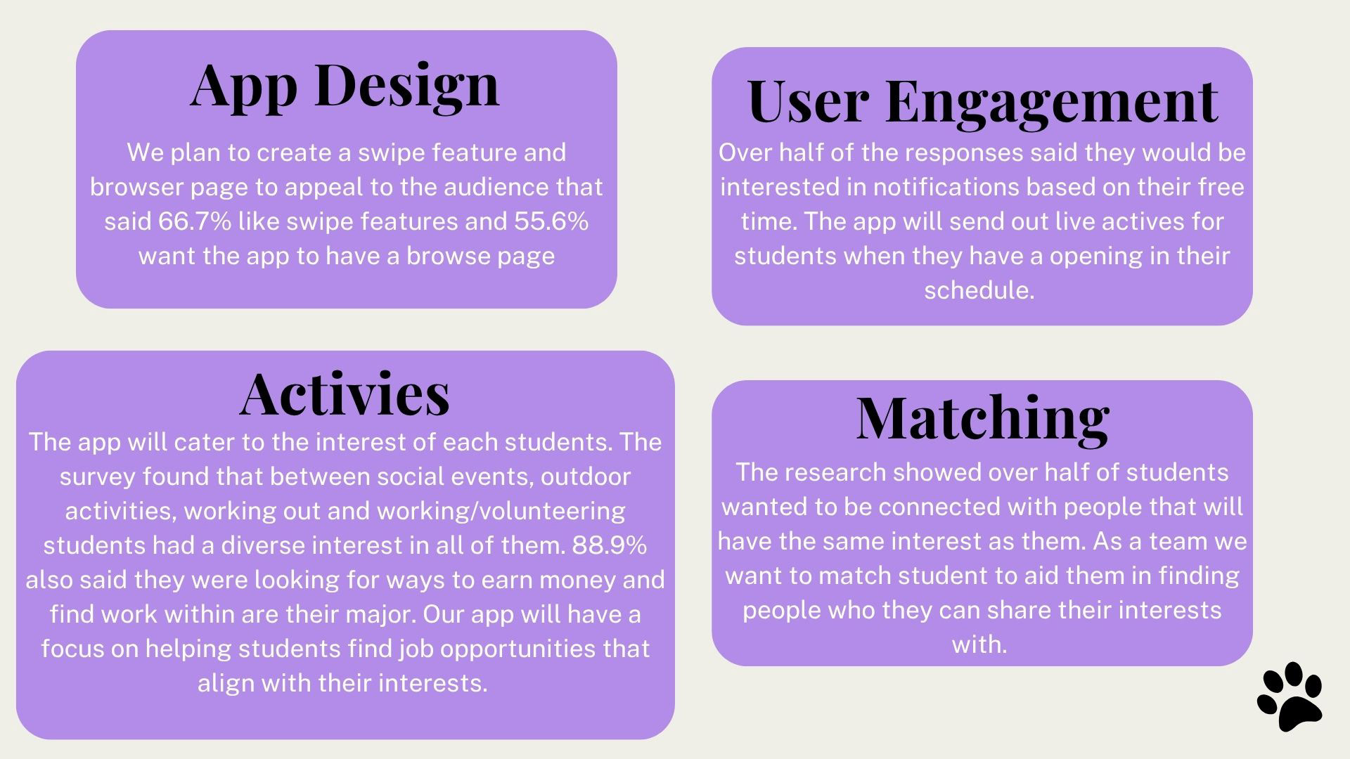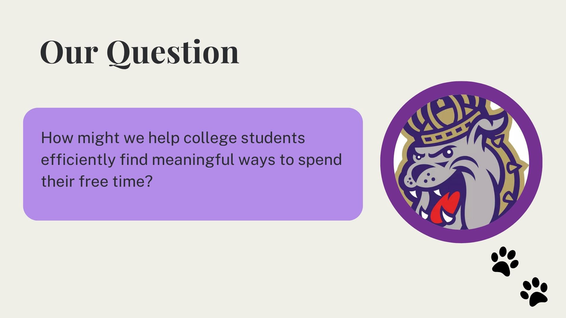 We developed a focused design question, crafted thoughtful research questions, and conducted both user interviews and Google Forms surveys to gather insights from students. I helped lead the analysis process, identifying user patterns, needs, and “a-ha” moments that directly informed our final design requirements.